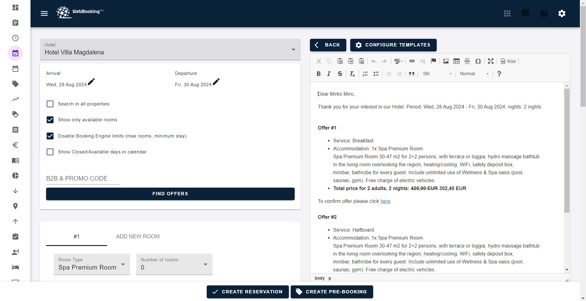 Koristite WebBookingPro s bilo kojeg mjesta ili uređaja, jednostavno kreirajte ponude/predbilježbe ili čak stvarne rezervacije s datumom opcije koje će biti poslane gostu za nekoliko sekundi. Gost može automatski potvrditi nepotvrđenu rezervaciju (opciju) ili čak izvršiti online plaćanje s jednim od mnogih podržanih sustava za naplatu i rezervacija će odmah postati potvrđena. Nepotvrđene rezervacije (opcije) mogu se automatski otkazati, a potvrđene rezervacije unutar vremena za besplatno otkazivanje gost također može automatski otkazati. Pošaljite svom gostu personaliziranu automatsku e-poštu prije dolaska (do 7 dana prije) na 5 različitih jezika. Pošaljite svom gostu personaliziranu e-poštu "hvala" po odlasku.