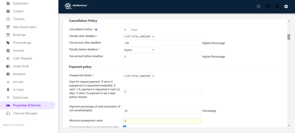 Now, if you use Payment gateway for credit cards you have to define policy which amount will be charged imediatelly or in some period x days from creating reservation or x days before checkin. Amount can be