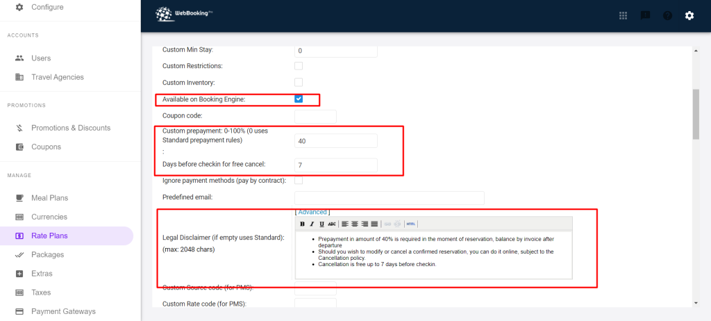 If you have additional Rate plans (e.g. special rates) on Booking engine you can set specific cancellation policy and payment policy for those rates. Edit your custom Rate plan (from Rate Plans menu on the left) and set following fields.