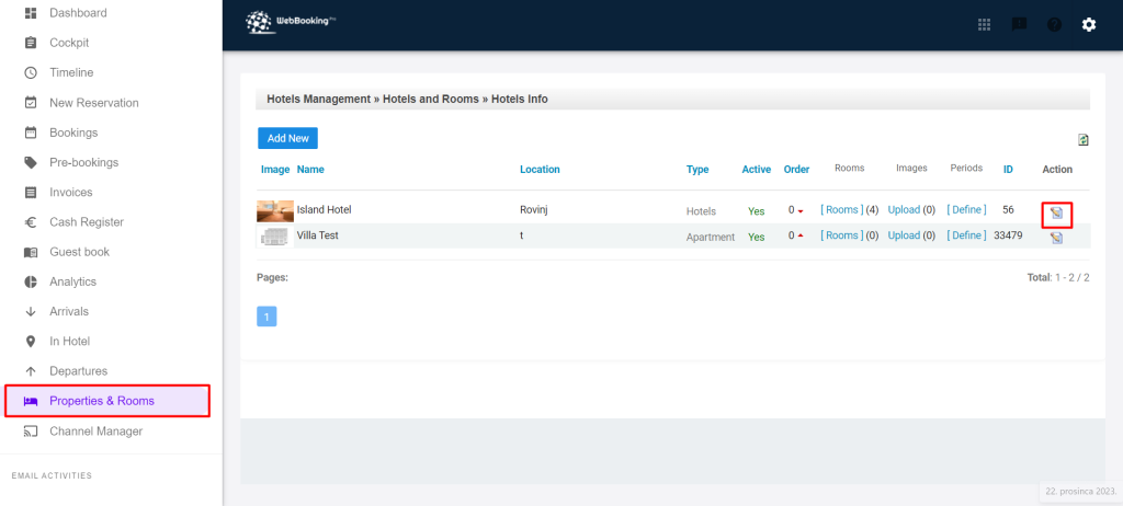 Go to Properties & Rooms from the left menu and choose Edit icon at the end of line.